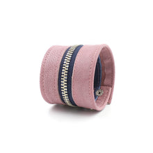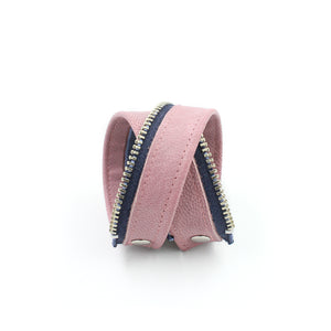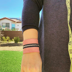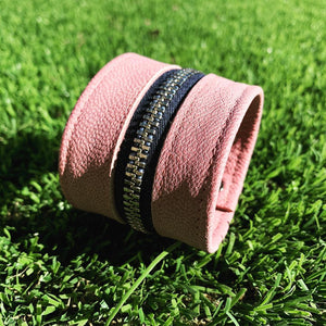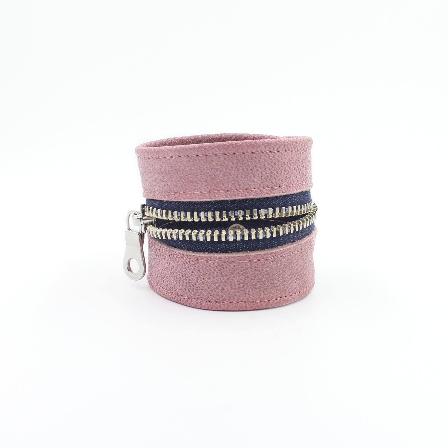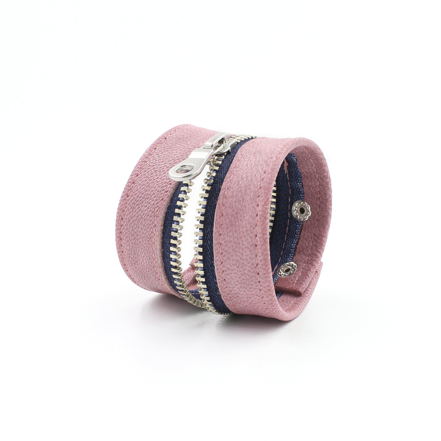 Genuine leather mixed with a denim blue zipper bracelet. Denim inner zipper with silver teeth.  Genuine pink leather outer bracelet. Pink topstitch. Silver snaps. Silver classic zipper pull. Bracelet width: 2 1/4" Size: Adjustable 2 ways to fit almost any size wrist, 7" and 8" (Small/Medium to Large)