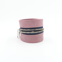 Denim inner zipper with silver teeth.  Genuine pink leather outer bracelet. Pink topstitch. Silver snaps. Silver classic zipper pull.