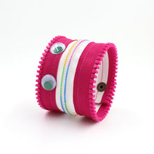 White inner zipper with rainbow teeth. Magenta pink outer zipper with magenta teeth. Hot pink topstitch. Copper snaps. Green Monster Eyes. White classic zipper pull.