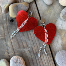 Handmade acrylic laser-cut giant red glittery heart earrings with silver chain dangling detail on stainless steel earring posts with push-back closure.