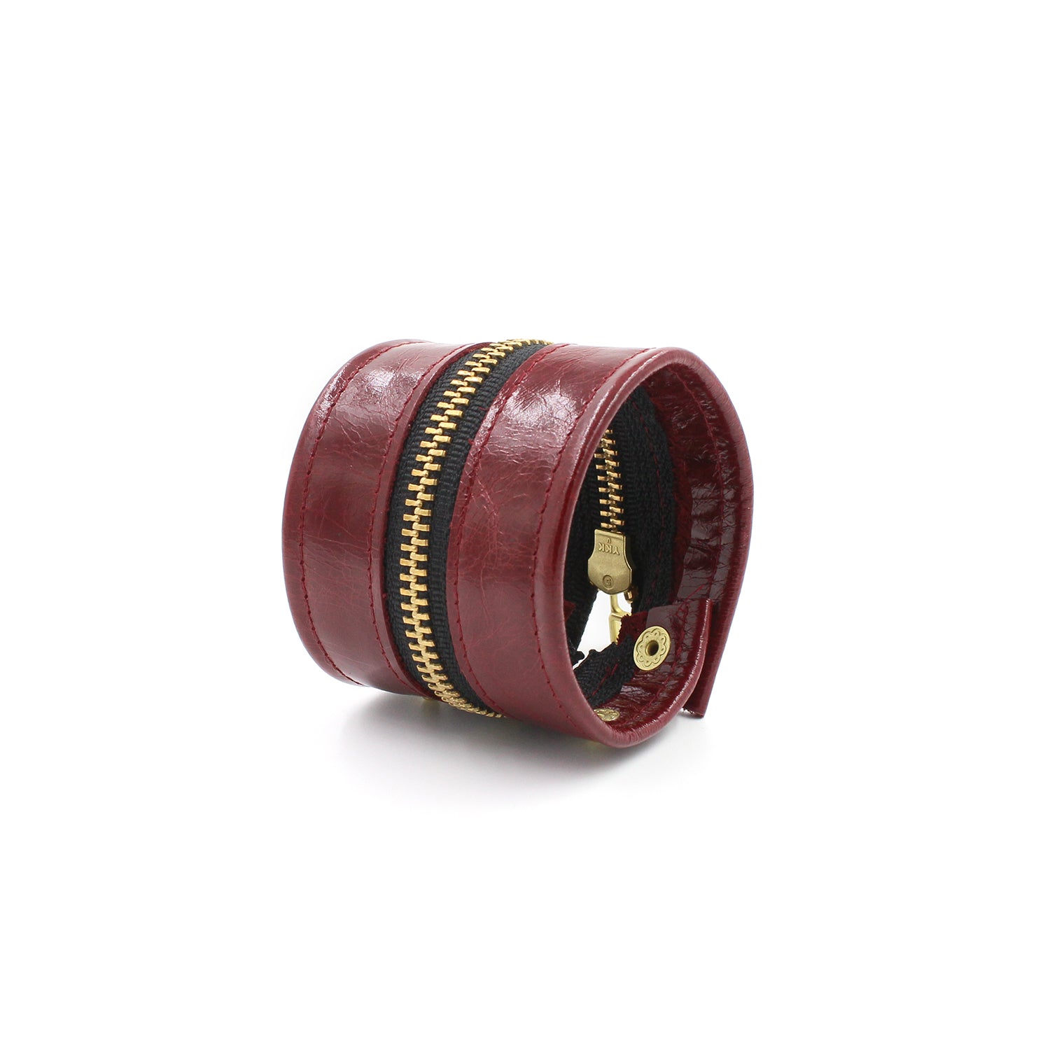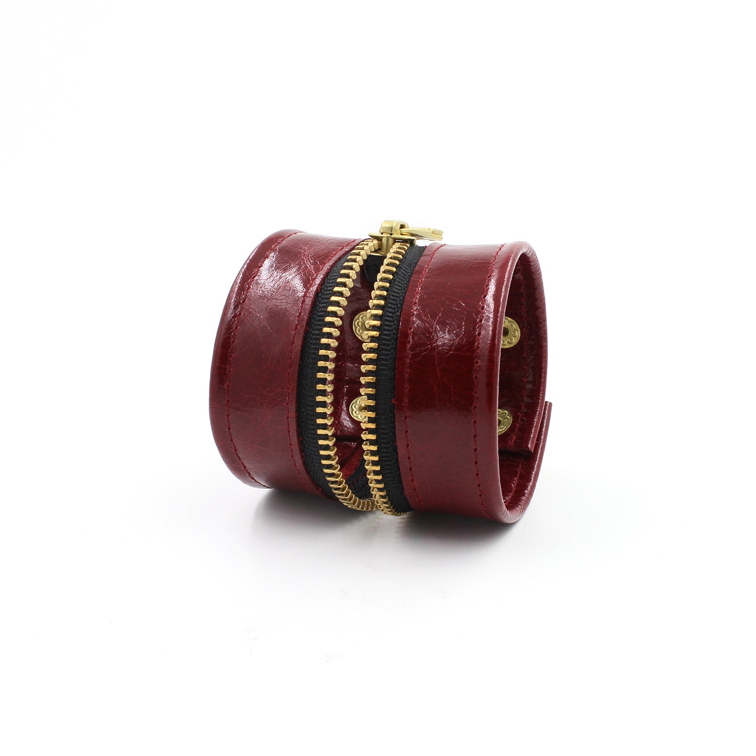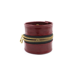 Black inner zipper with brass teeth. Genuine red leather outer bracelet. Red topstitch. Brass snaps. Brass classec zipper pull.