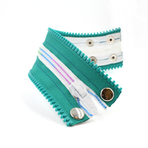 White inner zipper with rainbow teeth. Teal outer zipper with teal teeth. Blue topstitch. Nickel snaps. White classic zipper pull.