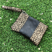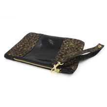 Handmade black and gold pattern and shiny black color-block genuine leather evening clutch/wristlet. Brass zipper closure. Black and Gold patterned leather wrist strap with brass rivet.
