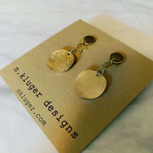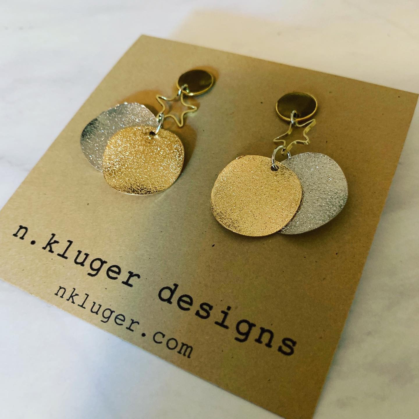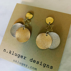 Gold & Silver metal wavy disc earrings with star connectors and with gold-tone stainless steel posts with push-back closure.