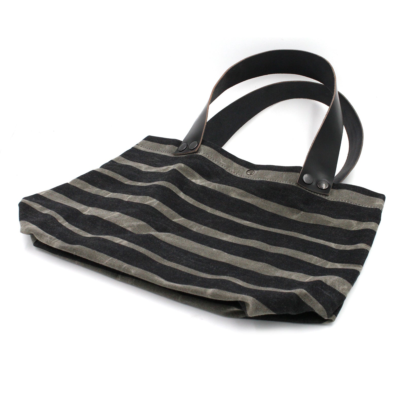 Small Charcoal Striped Waxed Canvas & Leather Tote Bag