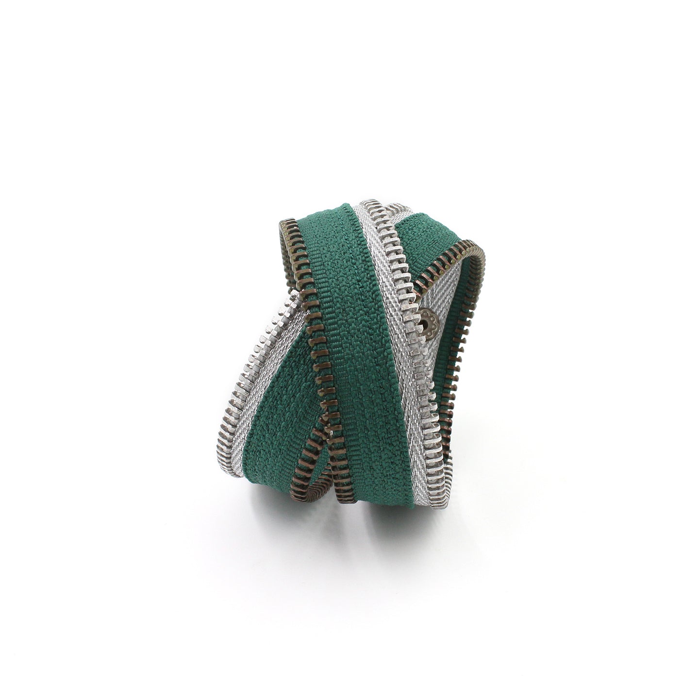 Metallic silver inner zipper with silver teeth.  Green outer zipper with antique gold teeth.  Green top stitch. Silver snaps.