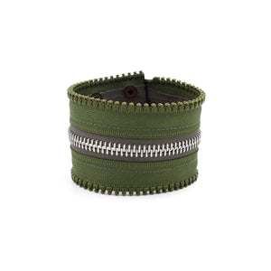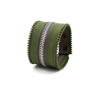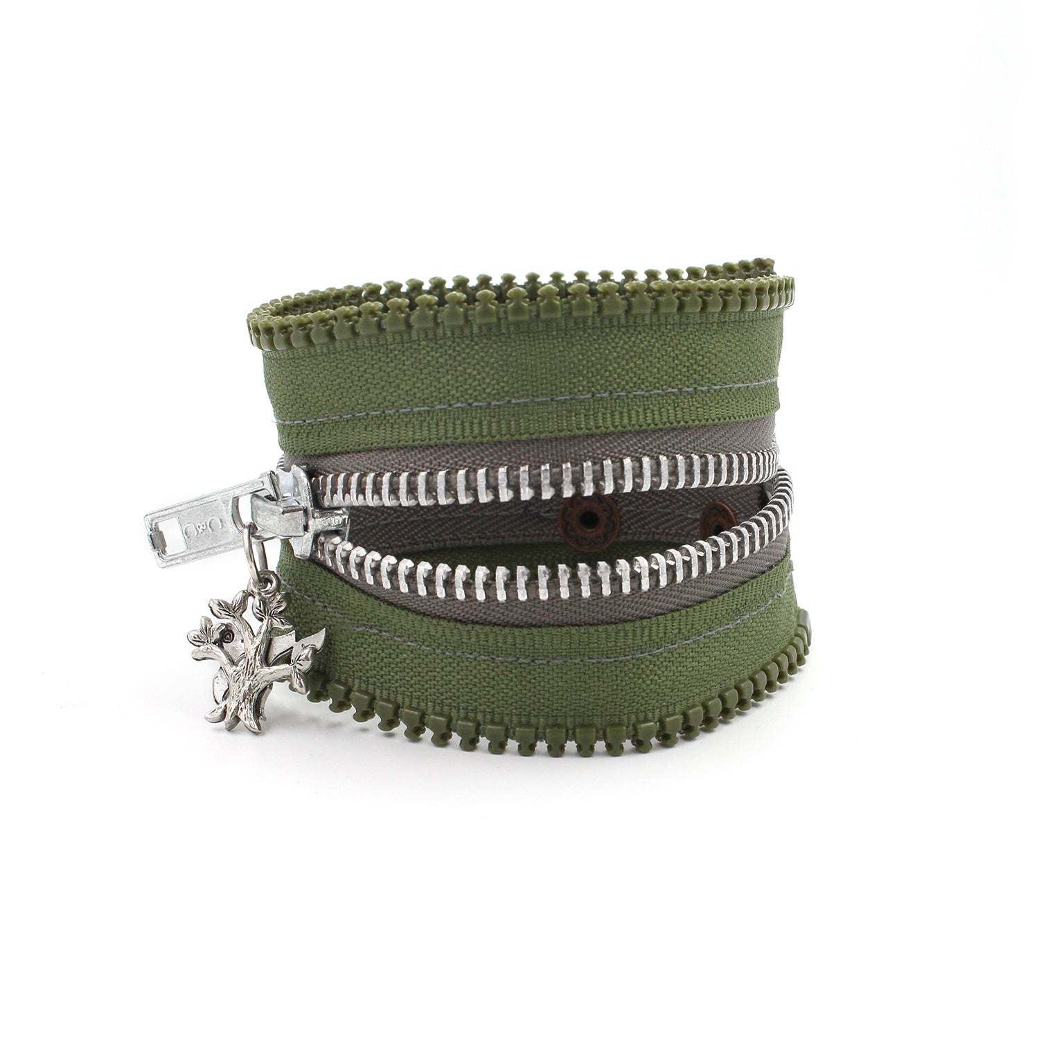 This zipper bracelet boasts a double sided charm- a tree of life on one side and a Hebrew Chai on the other. Chai translates into life, as well as the number 18. Grey inner zipper with nickel teeth.  Olive green outer zipper...